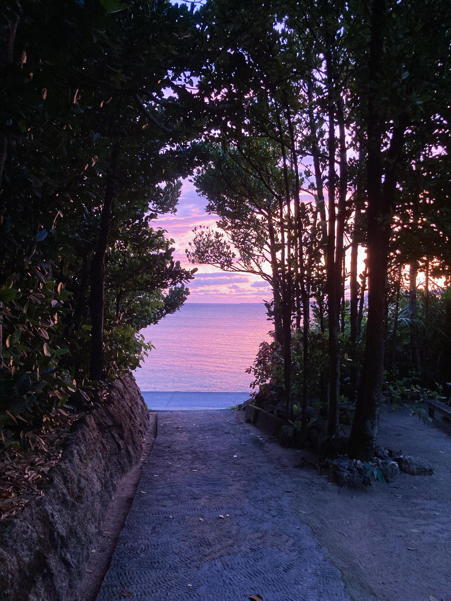 コテージがあるのは、ふくぎ並木で有名な本部町の備瀬地区。昔ながらの沖縄の趣を感じさせ、ふくぎ並木のやわらかな空気に包まれた静かな散策路がすぐそばにあります。緑のトンネルを抜ければ、コーラルリーフの向こうに伊江島を望む東シナ海と、青く広い空が広がります。黄昏どきには海に沈む美しい夕陽が、夜には満天の星空が見られます。