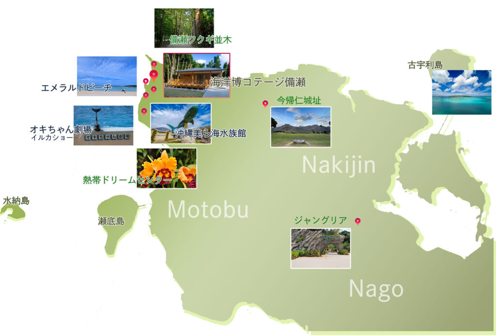 すぐ近くには海洋博公園があり、園内には沖縄美ら海水族館やエメラルドビーチなどの人気スポットがそろっています。さらに、備瀬お宮やワルミ、樹齢300年のフクギ、大きなガジュマルといったスポットも点在し、散策するだけで、沖縄の自然にふれられる環境です。