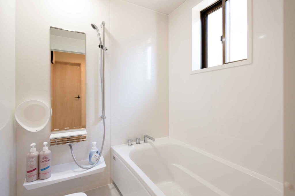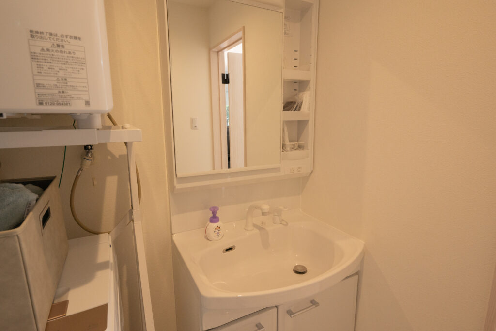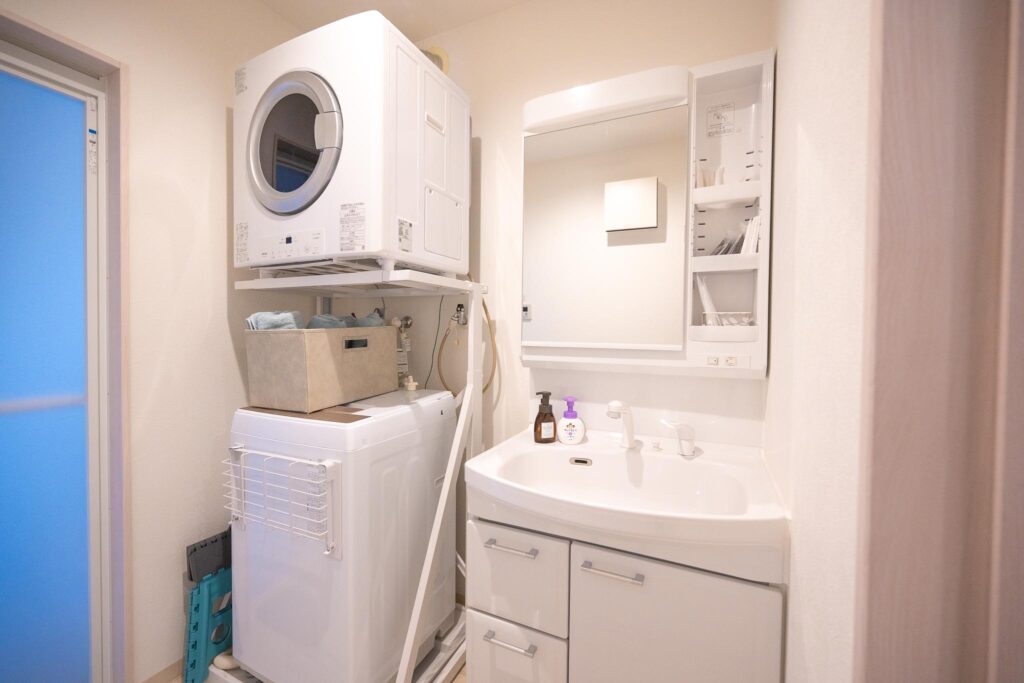 シャワー、バスタブ、鏡、ドライヤー、トイレ(洗浄機能付き)、洗面台、洗濯機、ガス乾燥機