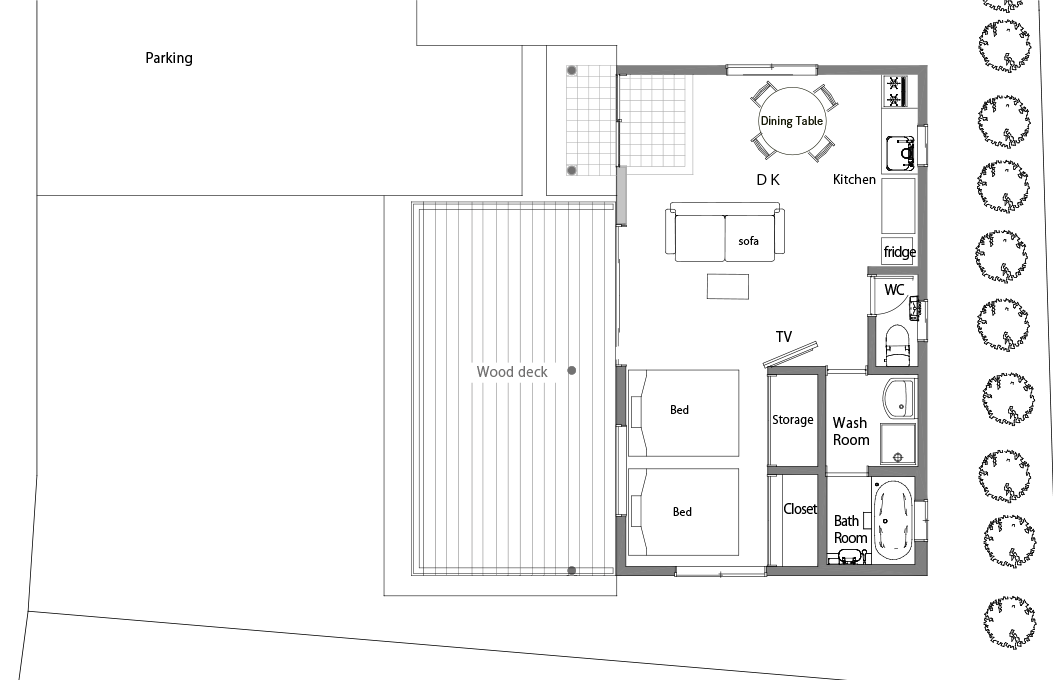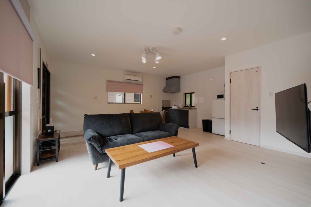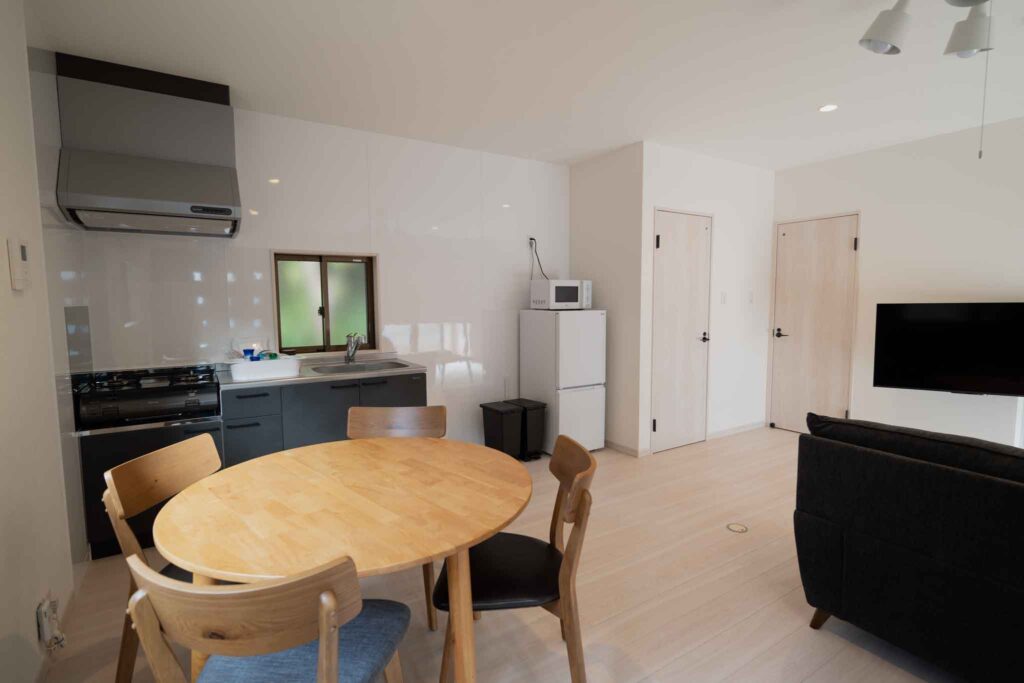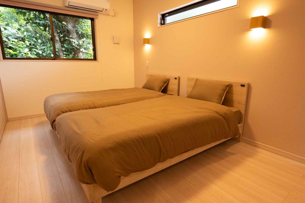 客室の広さは約37㎡。家族4人で過ごすには最適の広さです。シングルサイズのベッドが2台とマットレスが4セットあり、最大6名様まで宿泊が可能です。駐車場は無料で2台まで駐車可能。洗濯機、ガス乾燥機も完備。コンパクトなキッチンと無料でWi-Fi環境を提供しており、テレビでネット動画を見たり、ウッドデッキでバーベキュー、駐車スペースで花火なども楽しみいただけます。隣接するコテージと2棟あわせてご利用することで2世帯家族や多人数の友人・グループでもお楽しみいただけます。